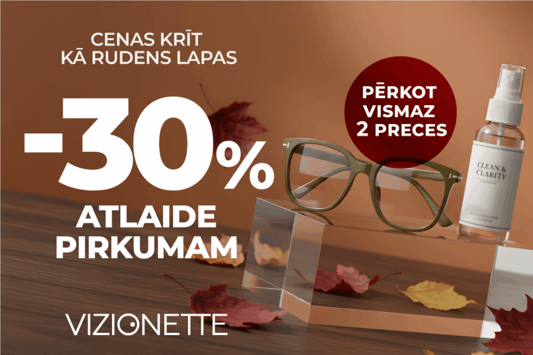 Akcija spēkā, pērkot jebkuras 2 preces – pilnu briļļu komplektu (ietvars, lēcas, pielāgošana), briļļu aksesuāru, kontaktlēcu iepakojumu, saulesbrilles vai citas preces.